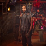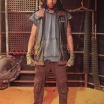 Damani porte un pantalon de couleur brun. Il porte un sweat bleu sombre très délavé. Par dessus de sweat, il porte un blouson en cuir sans manches très usé. Sa coiffure est faite de dreadlocks. Enfin, son visage porte des peintures de guerre blanches.